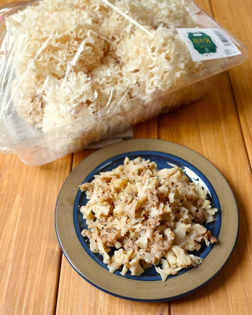 もりのわさまの「ハナビラタケ」。きのこ特有のクセがなくて、いろいろな料理に使いやすいなと思いました^^シャキっとした食感もあっておいしかったです!
