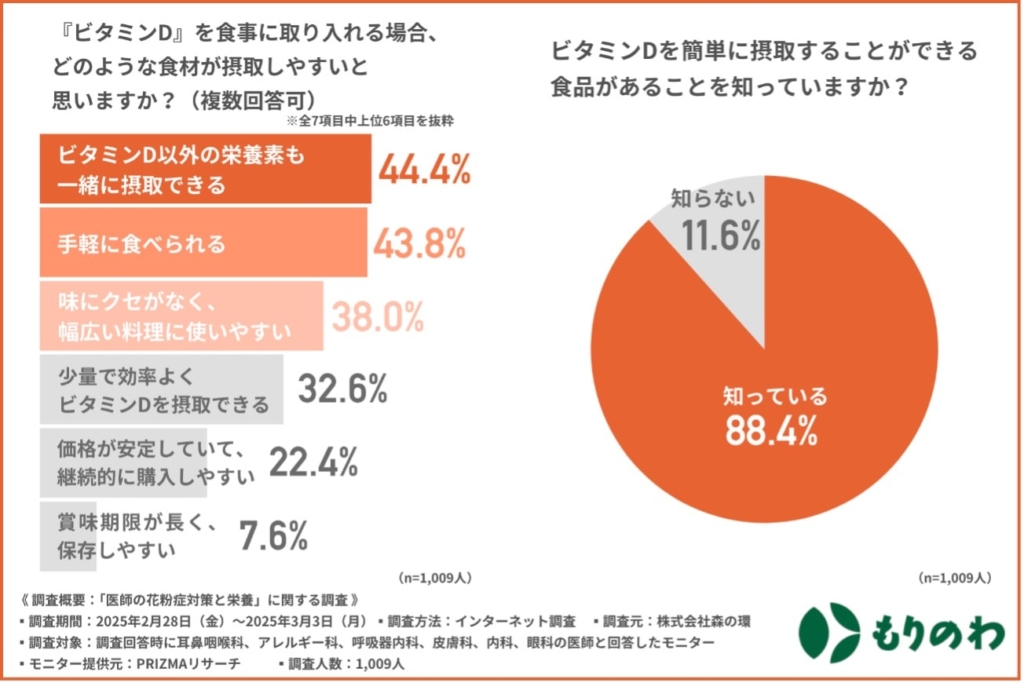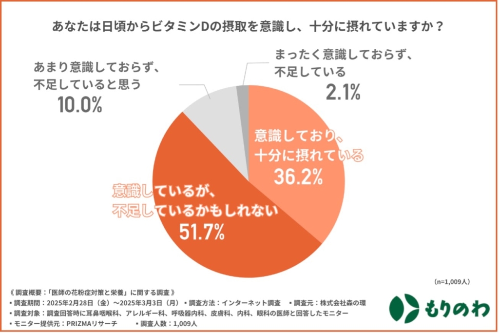 株式会社森の環が、耳鼻咽喉科、アレルギー科、呼吸器内科、皮膚科、内科、眼科の医師を対象に「医師の花粉症対策と栄養」に関する調査を行ったところ、約9割の医師がビタミンDは花粉症の症状緩和に役立つ可能性があると認識していることが明らかになりました。