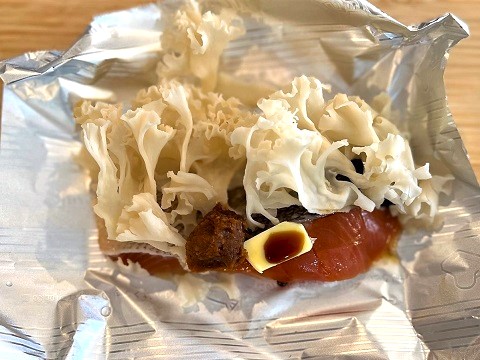1.ホイルに鮭、はなびら茸を細かく手で割いたものをのせて、味噌、バター、醤油、鮭、蜂蜜をのせる。