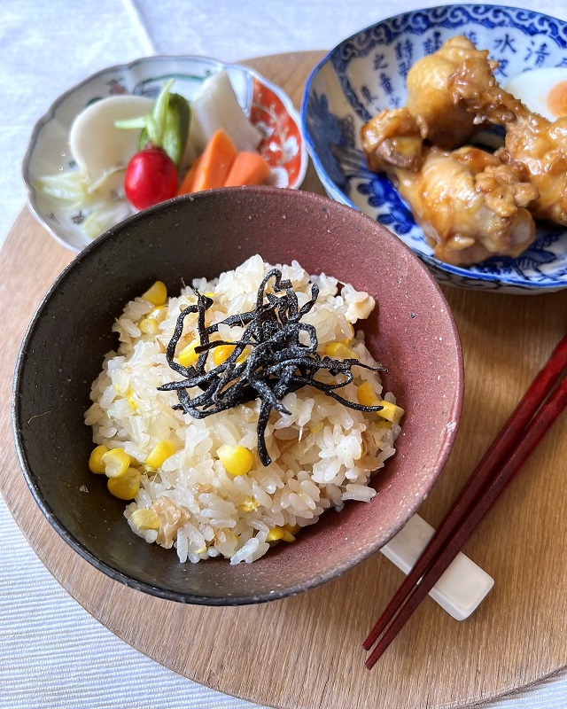 *乾燥はなびら茸は、水に戻さず、そのまま入れるだけ!シャキシャキとした食感、うまみも加わり、簡単にとうもろこしごはんがワンランクアップします。塩昆布を一緒に炊き込むとさらに旨みも増しますが、少し黒っぽくなるので、後のせにしています。