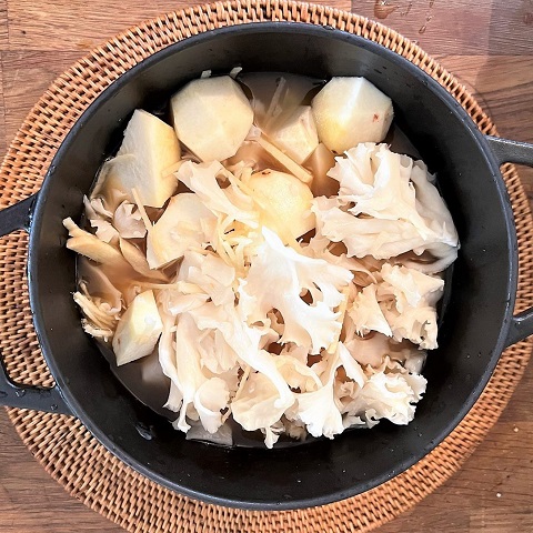 2.1に、皮をむき2㎝角ほどに切った里芋と、食べやすい大きさに割いたはなびら茸、調味料をすべていれて炊飯して完成。