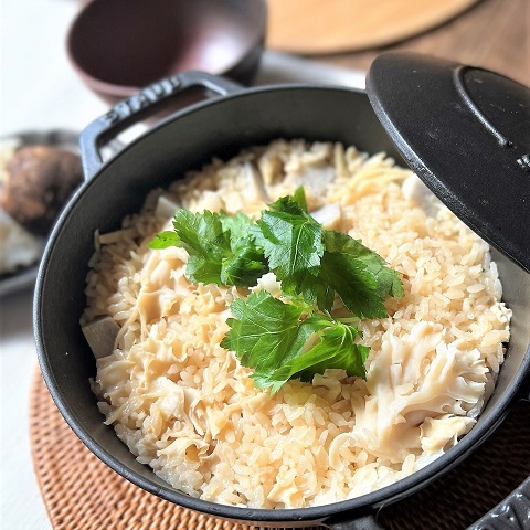 免疫力を高め、シャキシャキとした食感がおいしいはなびら茸とくみあわせ、簡単にできる炊き込みごはんです。