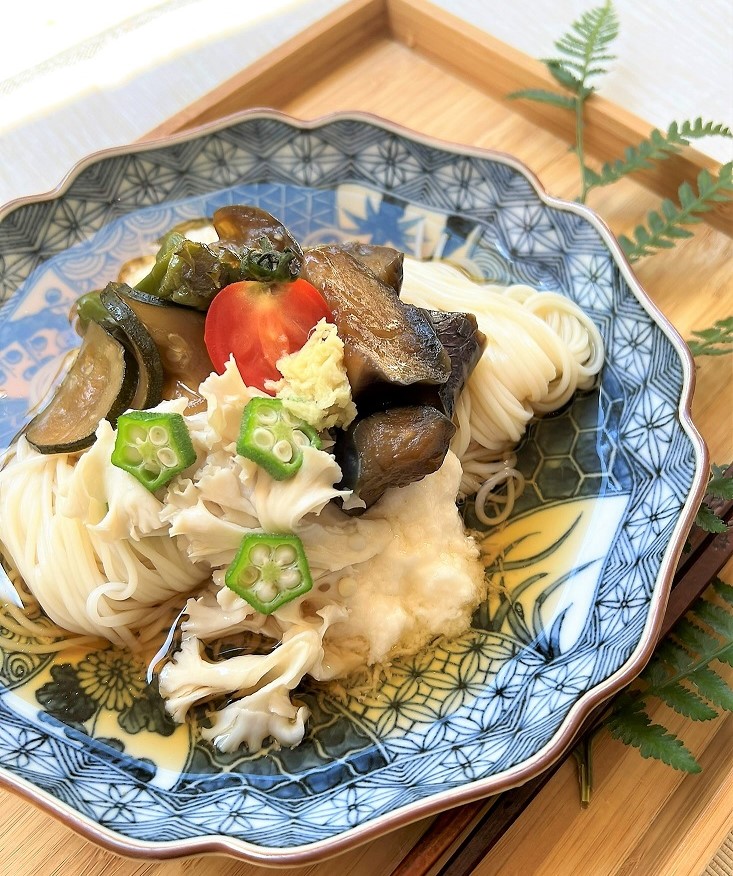 3.そうめんを時間通りゆで上げ、水で〆てから器にもりつけ、山芋のすりおろしと、「2.」の煮た野菜と、「1.」をのせ、プチトマトは2等分に切り、生姜をのせてそうめんのお出汁をかけて完成。