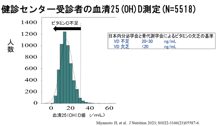 東京慈恵会医科大学 臨床検査医学講座 越智小枝教授らは、島津製作所と新開発の液体クロマトグラフィー・質量分析法(LC-MS/MS)システムを使用して、2019年4月から2020年3月までの期間に東京都内で健康診断を受けた5,518 人を対象に調査を実施。その結果、98%がビタミンD不足に該当していたことを2023年6月に発表しました。
