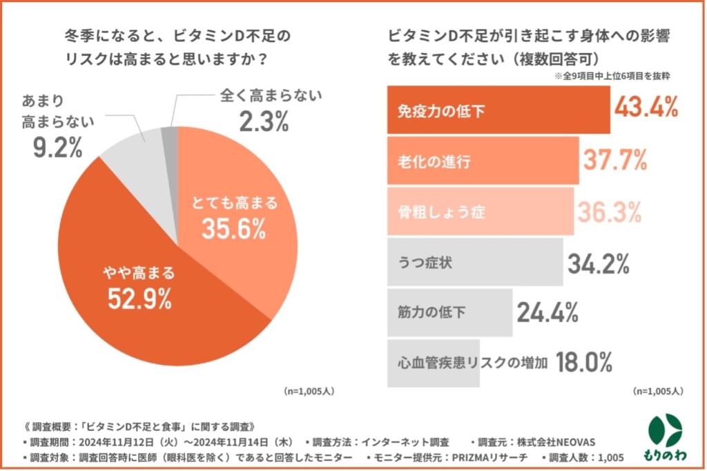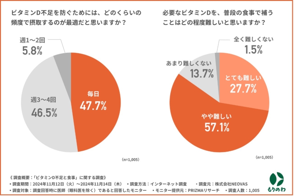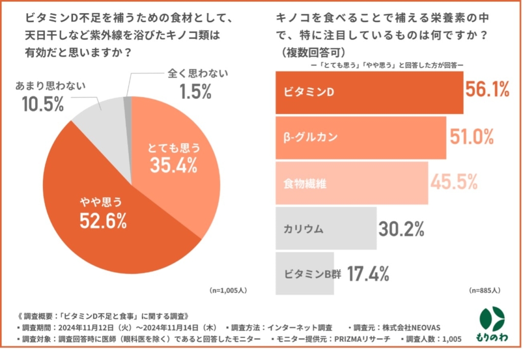 株式会社森の環が、医師(眼科医を除く)を対象に「ビタミンD不足と食事」に関する調査を行ったところ、冬季にはビタミンD不足のリスクが高まることが多くの医師によって認識されていることが浮き彫りになりました。一方で、日常の食事からビタミンDを十分に補うのは難しいという意見が多数を占めており、手軽にビタミンDを摂取できる手段として紫外線を浴びたキノコ類が注目されていることがわかりました。
