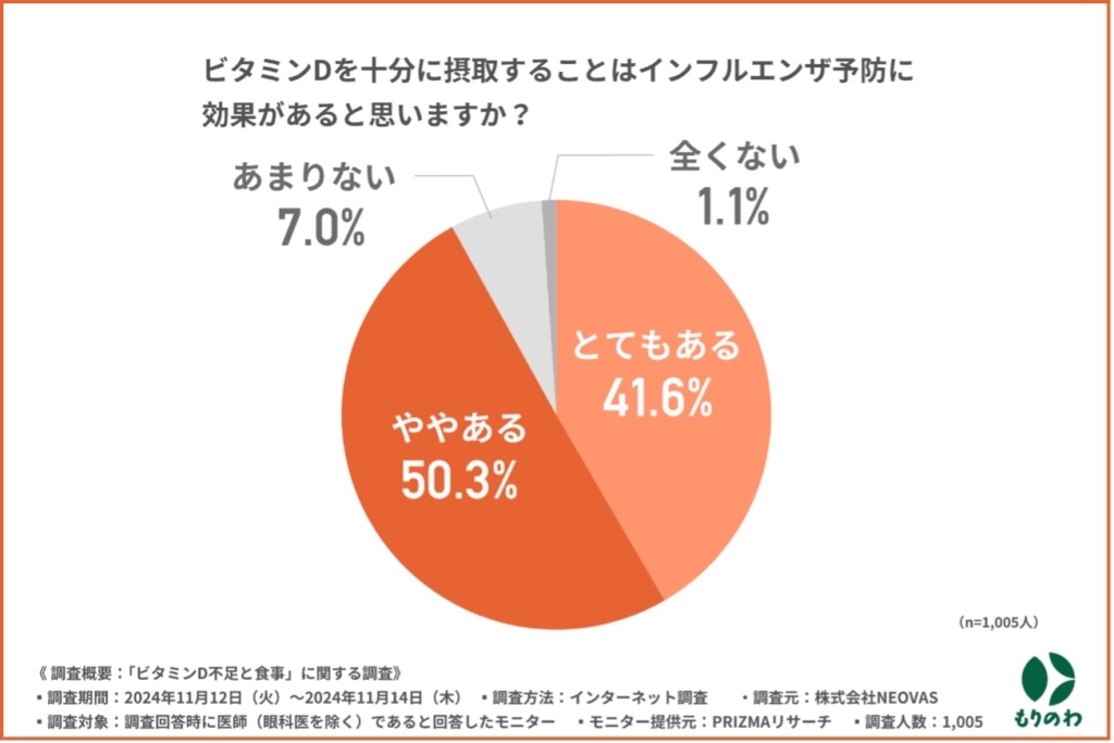 「ビタミンDを十分に摂取することはインフルエンザ予防に効果があると思いますか?」という質問には、9割以上の方が『とてもある(41.6%)』あるいは『ややある(50.3%)』と回答しました。