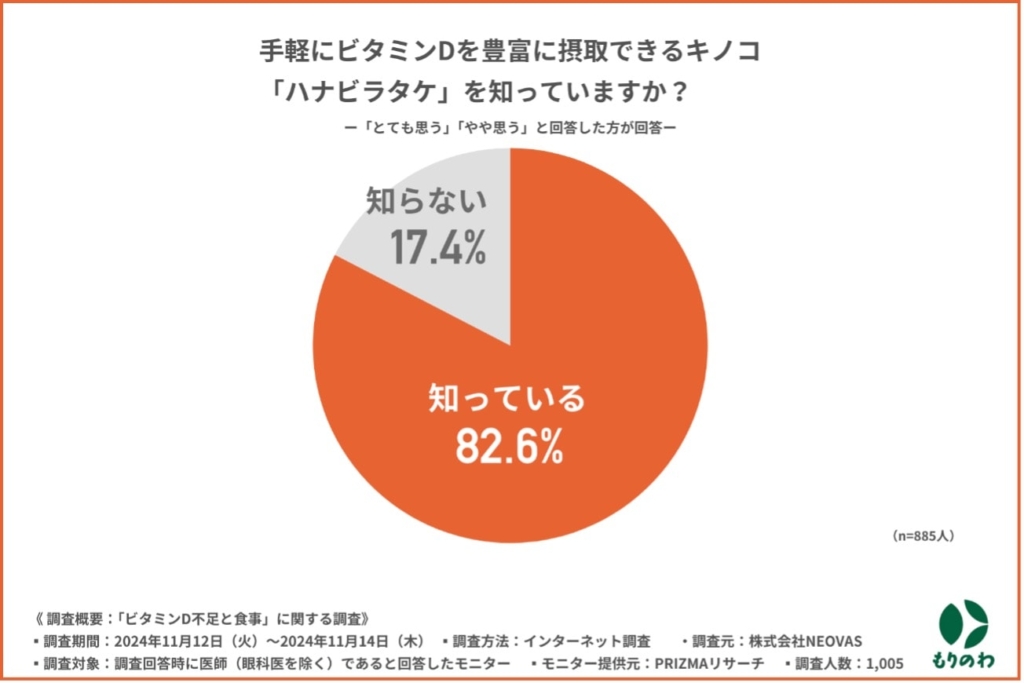 そこで、引き続き前の質問で『とてもそう思う』『ややそう思う』と回答した方に、「手軽にビタミンDを豊富に摂取できるキノコ『ハナビラタケ』を知っていますか?」と質問したところ、『知っている(82.6%)』と8割以上の方がハナビラタケを知っている事が分かりました。